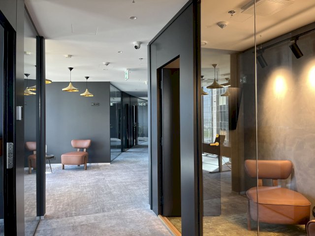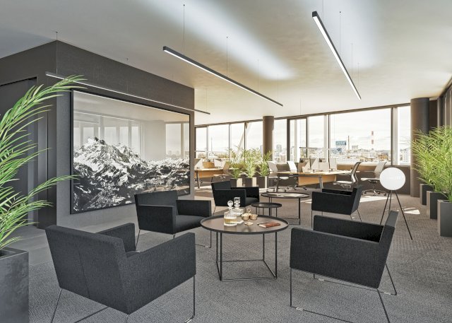 In addition to office spaces, there is co-working space SPACES, where is possible to rent workspaces and meeting rooms. Tenants can enjoy a sports club with an outdoor terrace, also relaxation area with a pools and saunas. The 15-story building has a rooftop terrace with stunning views, accessible to all tenants.