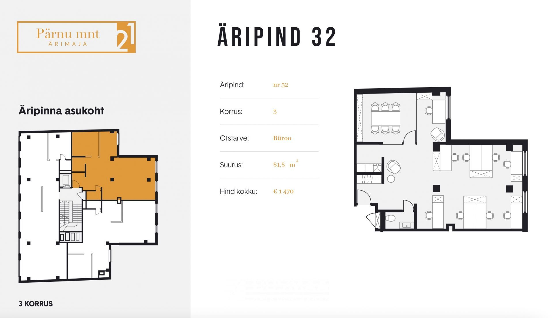 Üürile anda uus esinduslik büroo Pärnu mnt 21/2 ärihoones. Büroos on avar, avatud planeeringuga tööala, nõupidamisruum, sisustatud kööginurk (sh külmik, nõudepesumasin ja mikrolaineahi) ning tualettruum. Pind on valgusküllane ja hubane, esindusliku siseviimistlusega. Aknad avanevad Tatari tänava suunas. Bürooos on ruumipõhiselt reguleeritav sisekliima, samas on ka aknad avatavad.
