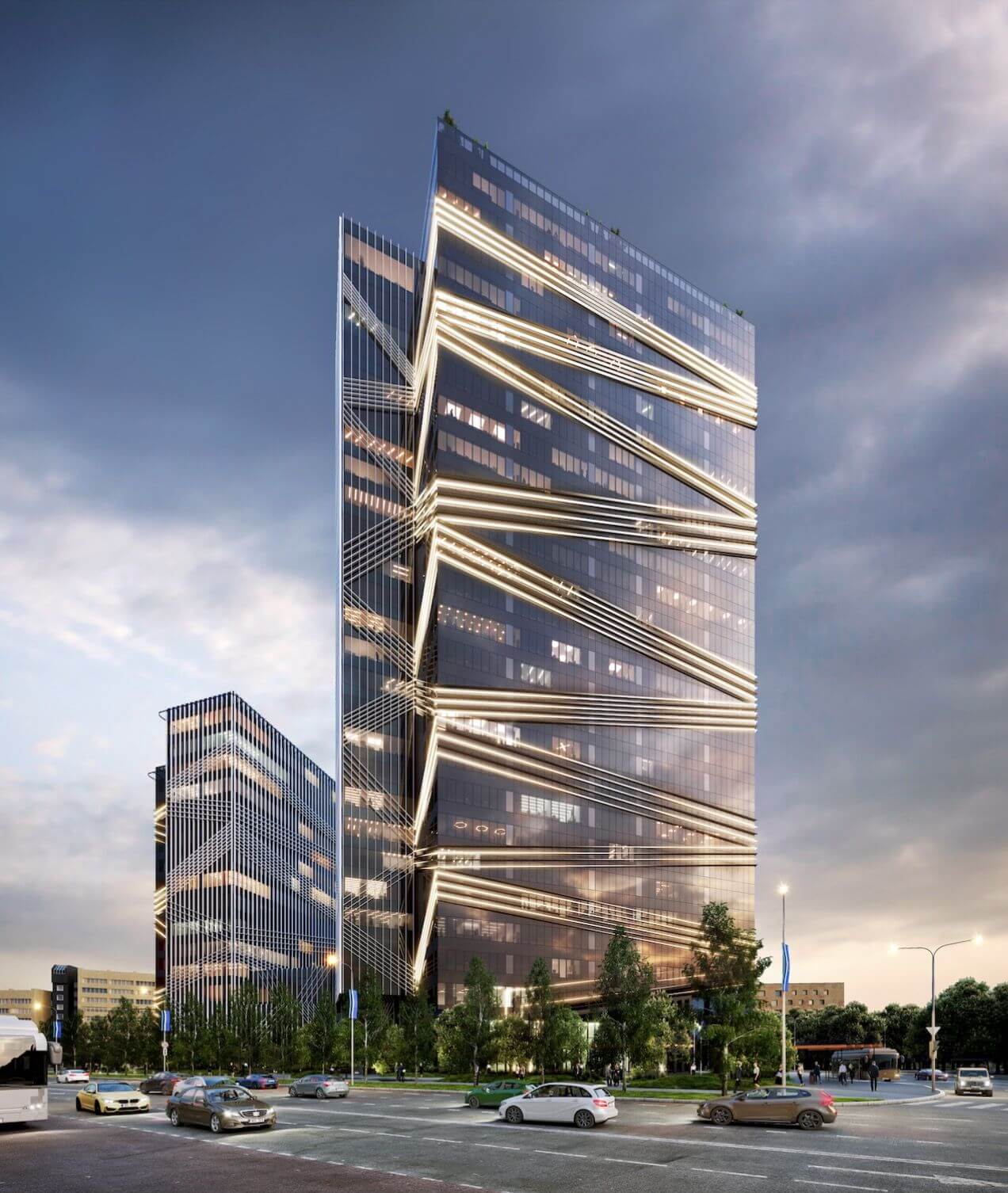 There are two entrances to the space from the elevator hall, allowing for the separation of client areas and back-office, or the division of the space into two separate entrance offices (each with its own kitchen, toilet rooms, and other auxiliary facilities). The building features a spacious lobby, as well as security alarm and video surveillance, with exterior doors locking outside working hours.
