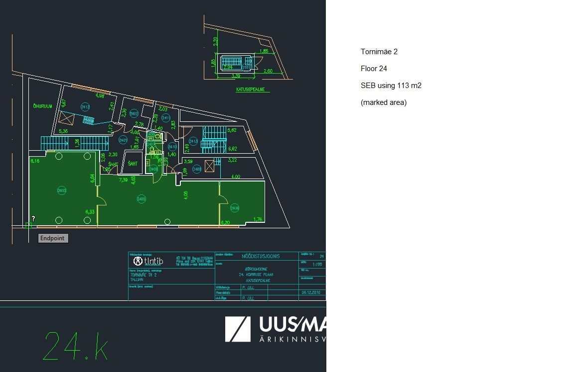 Üürile anda imelisi vaateid pakkuv büroo Tornimäel SEB hoone 24. korrusel (ligipääs liftiga on 23. korrusele, edasi trepp). Pind koosneb avatud büroost, kabinetist ja nõupidamisruumis. Olemas on väike kööginurk ja tualetid. Vajadusel saab lisaks üürida 7,6m pinna. Ruumides on kaasaegne valve-, ventilatsiooni- ja jahutussüsteem. Hoonel on BREEAM rohesertifikaadi “Very Good” tase.