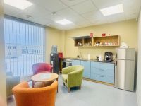 The office is arranged over two floors with a functional layout. The first floor includes changing and washing facilities. The second floor features a lounge area with a kitchen, as well as a sauna and washing room.