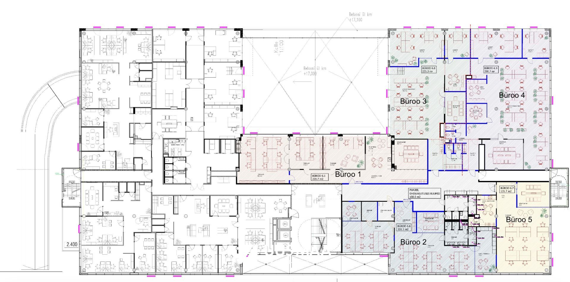 Pind tekib suurema büroo jagamisel, seega saab kaasa rääkida ruumilahenduse, siseviimistluse ja veidi ka pinna suuruse osas. Fotogaleriis on näited siseviimistlusest.