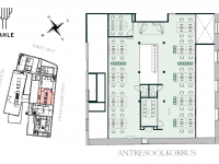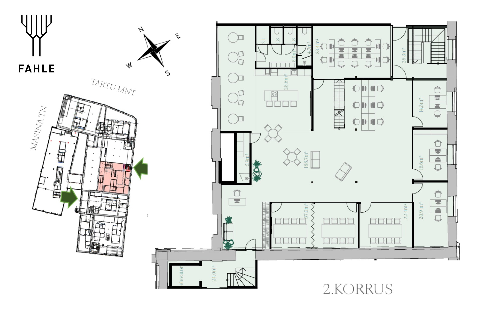 Hoone 2. korrusel paiknev büroopind on kahetasandiline: alumisel tasandil paiknevad kabinetid, koosolekuruumid, puhkeala/kööginurk ja antresoolkorrusel on peamiselt avatud planeeringuga tööala. Büroo mahutab maksimaalselt 70 töökohta. Antresoolikorrusel on väga kõrged, ligi 5,5 m kõrgused laed. Loomulikku päevavalgust annavad suured katuseaknad ja avar ruumiplaneering. Pinnal on kolm eri suuruses koosolekuruumi, kõneboksid, vastuvõtuala, panipaik, tualetid ja duširuum.
