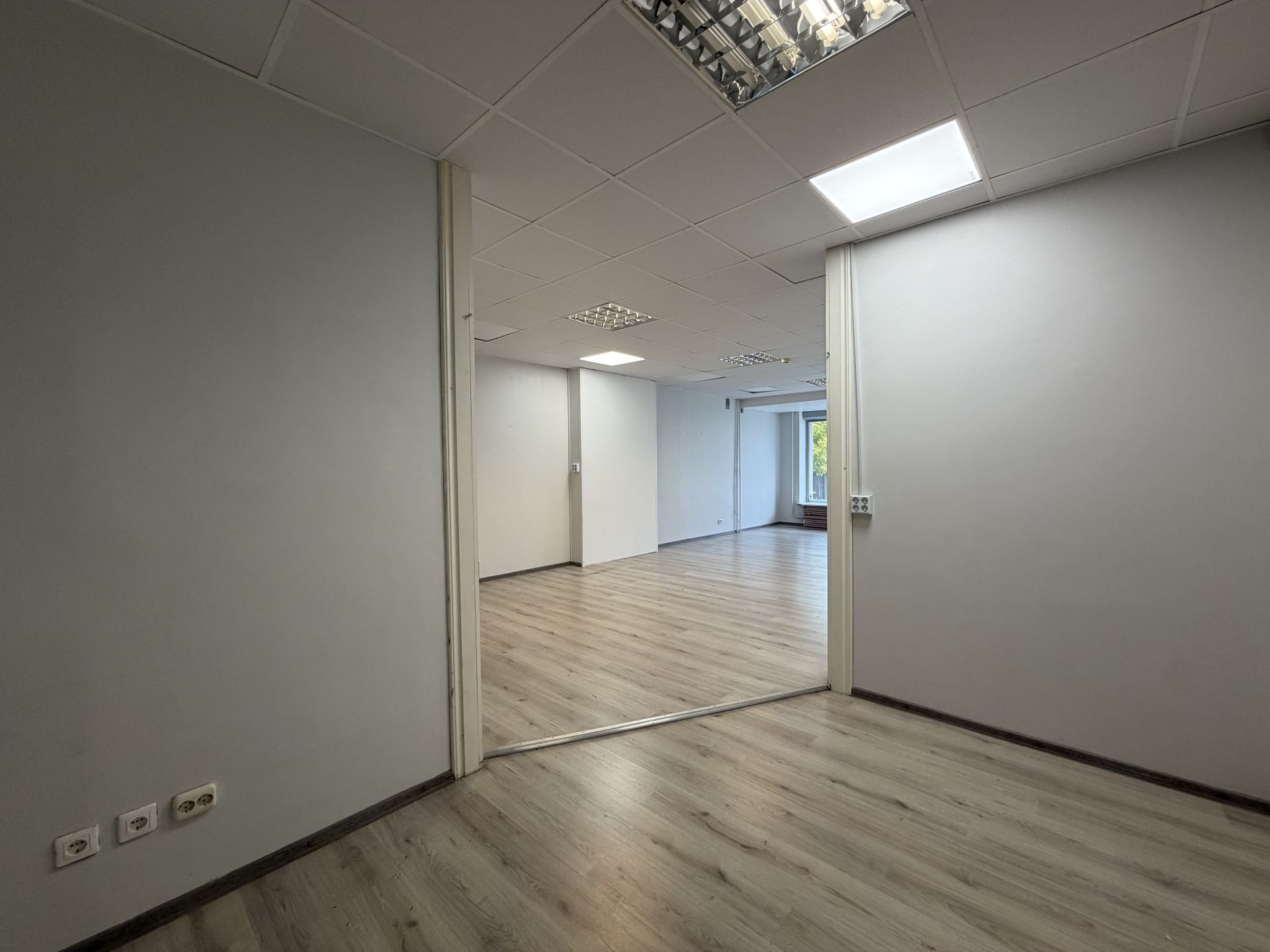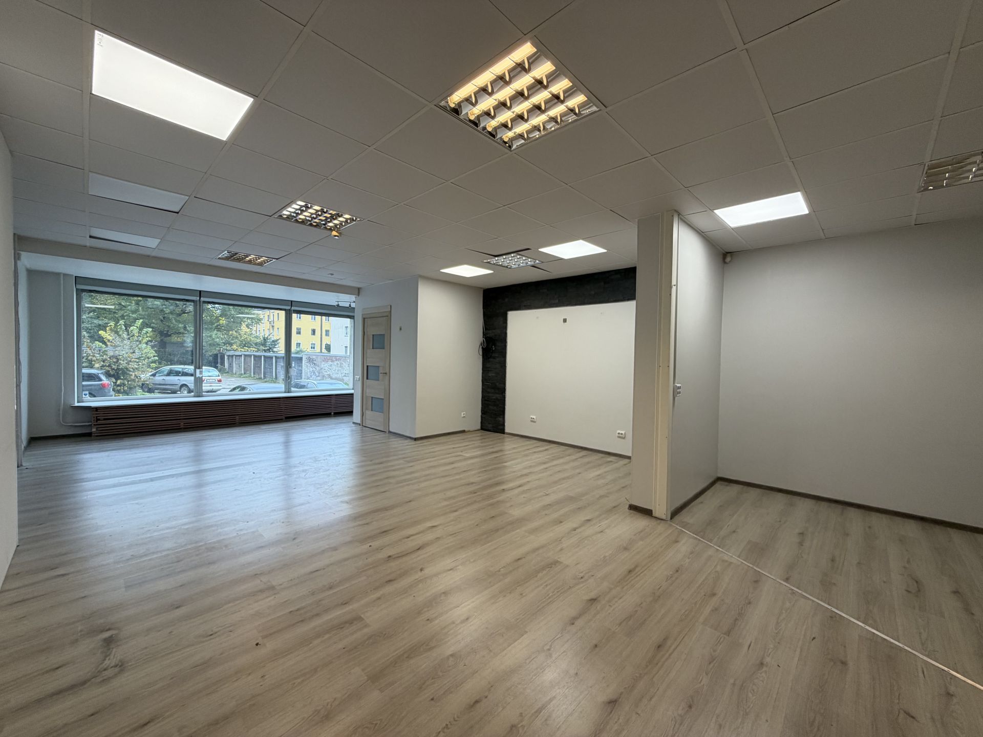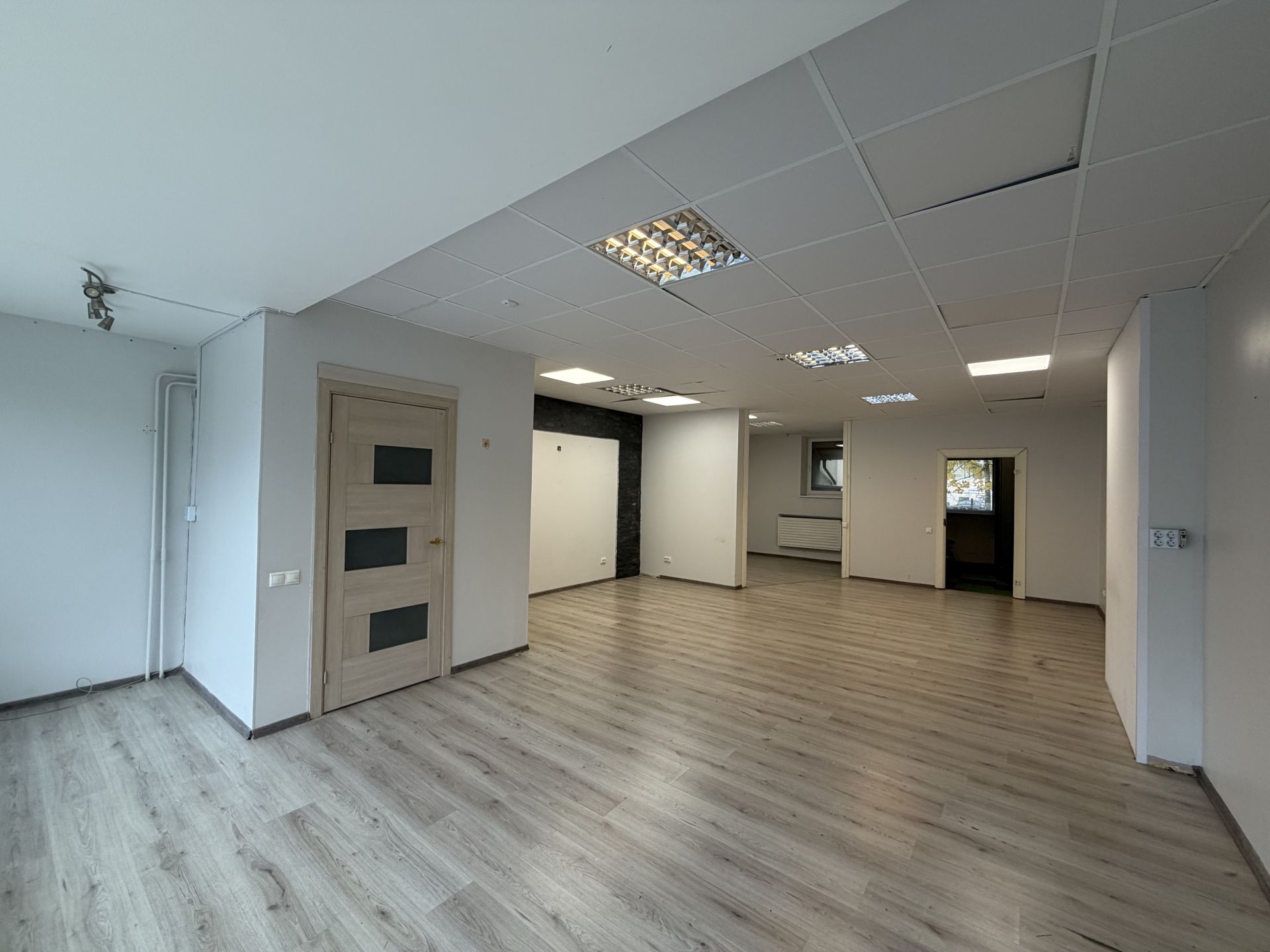 1. korrusel paikneb suurem avatud ruum, mille tagumises osas on väiksem kontoriruum. Ruumi tagumisest otsast pääseb väiksemasse esikusse, millest ligipääs kinnisele rõdule ning 0-korrusele. Esikusse on rajatud WC.